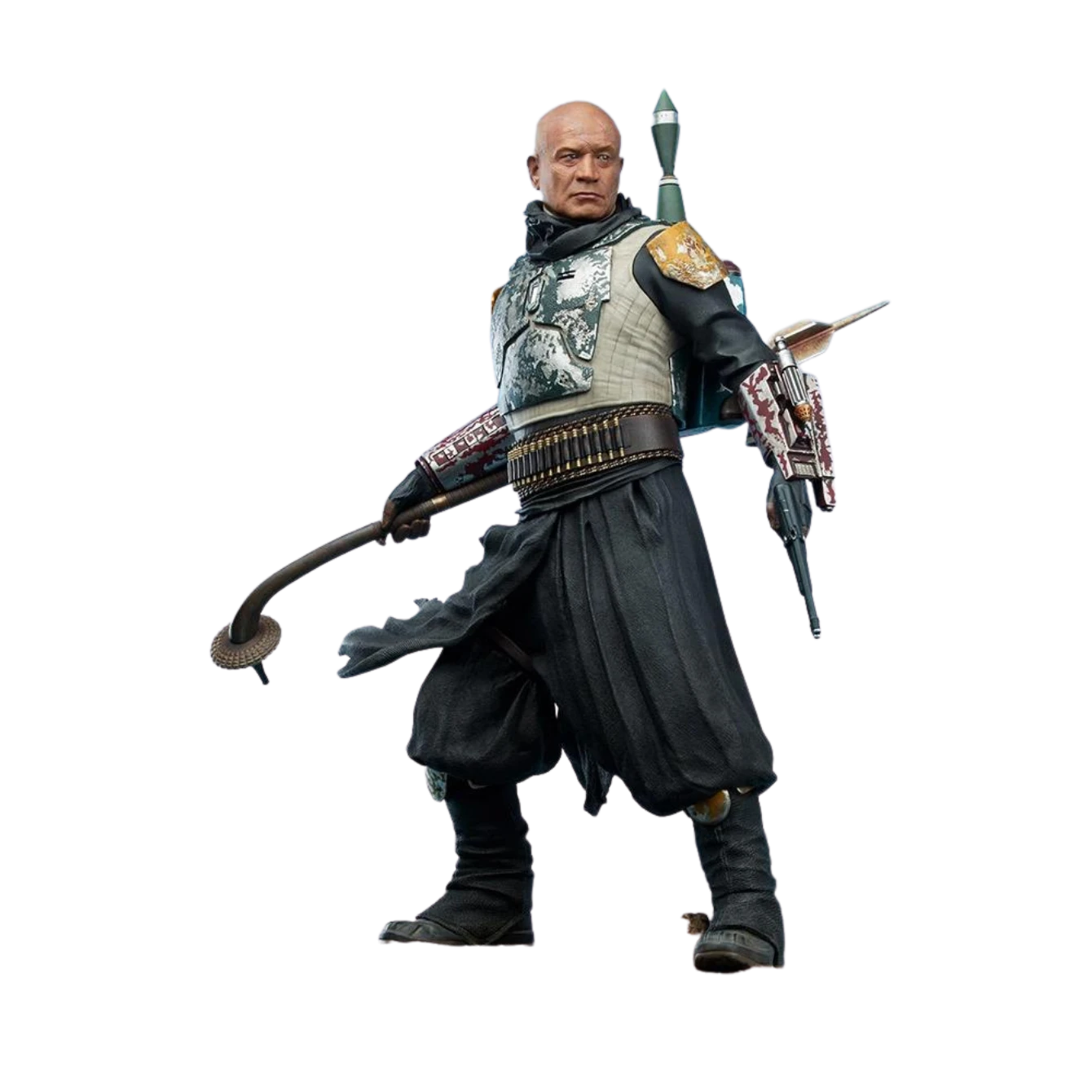 in “Chapter 14: The Tragedy.” The Boba Fett Premium Format Figure measures 22.38” tall and 15” wide, standing on a rocky Tython™ base, the site of the battle against Moff Gideon’s™ Imperial forces. With his armor donned and weapons in hand, Boba Fett fights with honor and intensity to uphold his end of the deal with Din Djarin™.