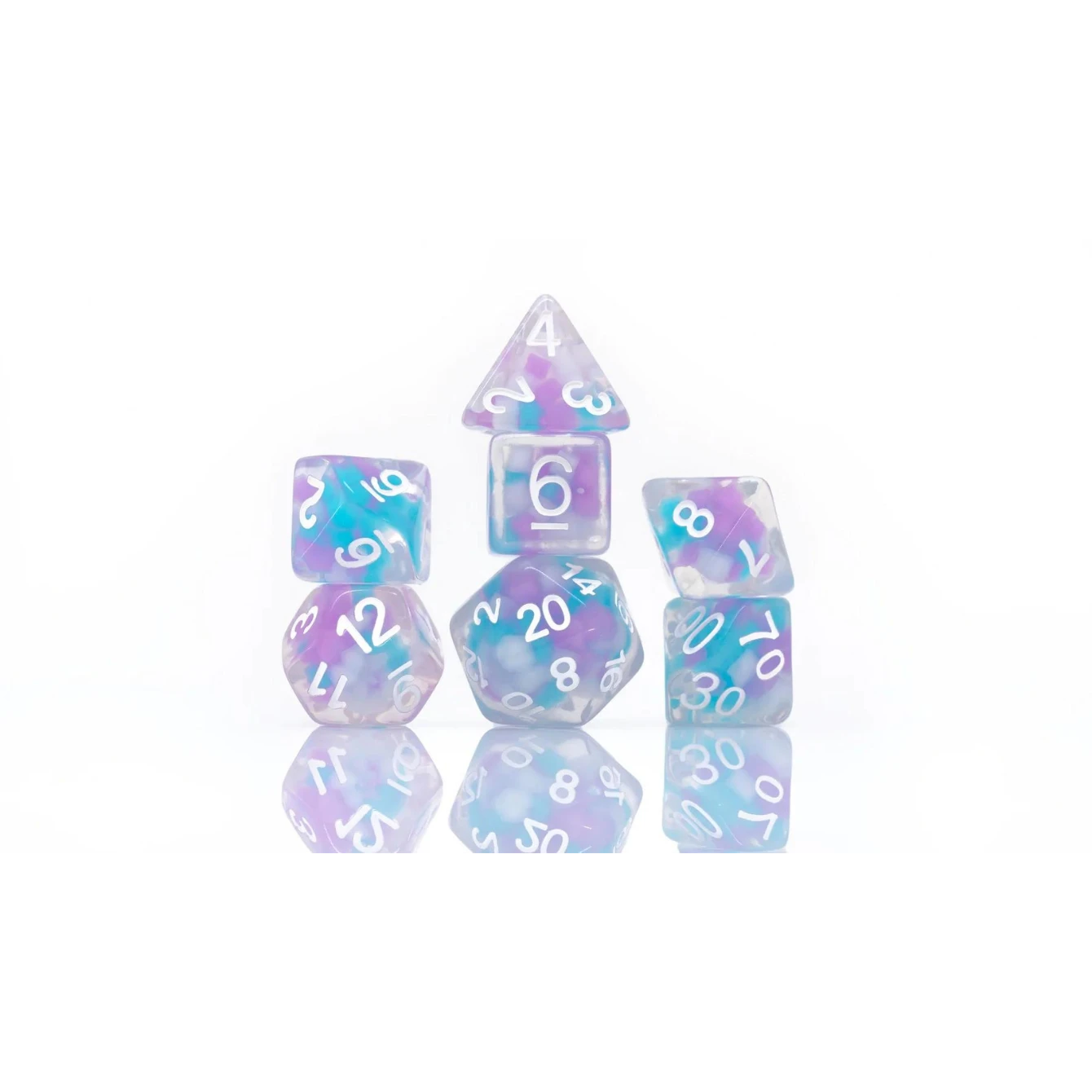 Glow-in-the-dark beads inside translucent resin. Set of 7 polyhedral dice plus 1 extra D20. Packaged in a flat-bottom tube, so you can easily carry and store your dice.